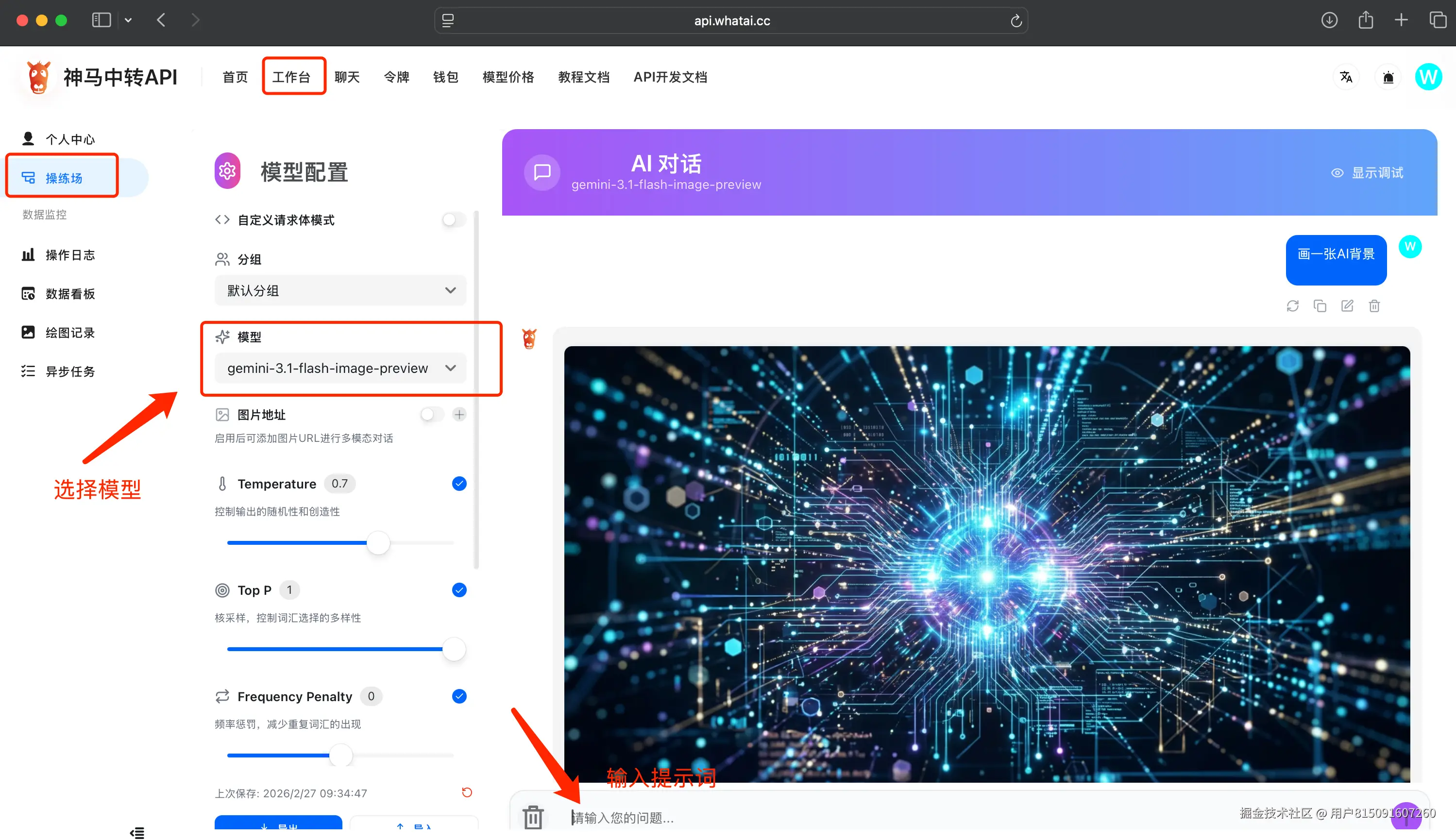 首页-工作台-操练场选择模型gemini-3.1-flash-image-preview,输入问题测试使用或者API接入(支持gemini、openai、dall-e格式)