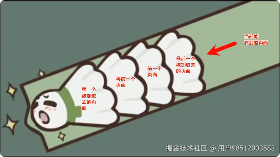 - 退出当前页面的时候,相当于把羽毛球桶最上面的羽毛球拿了出来,就能看到被压在下面的羽毛球了,被压在下面的羽毛球就是页面被加到里面的顺序,也就能保证记录页面的跳转历史了。