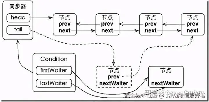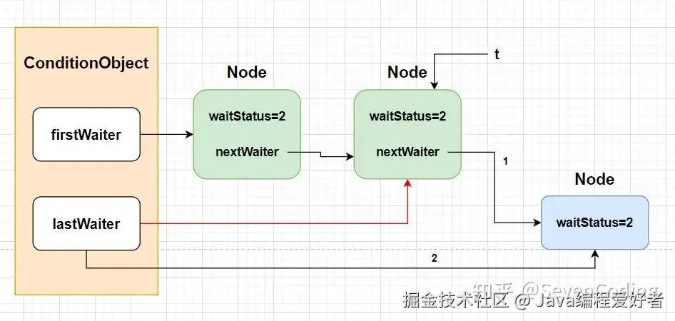 事实上,节点的定义复用了 AQS 中 Node 节点的定义,也就是说,同步队列和等待队列中节点类型都是 AQS 的静态内部类 AbstractQueuedSynchronized.Node。一个 Condition 包含一个等待队列,Condition 拥有首节点(firstWaiter)和尾节点(lastWaiter)。当前线程调用 Condition.await() 方法之后,将会以当前线程构造节点,并将节点从尾部加入等待队列,等待队列的基本结构如下所示。