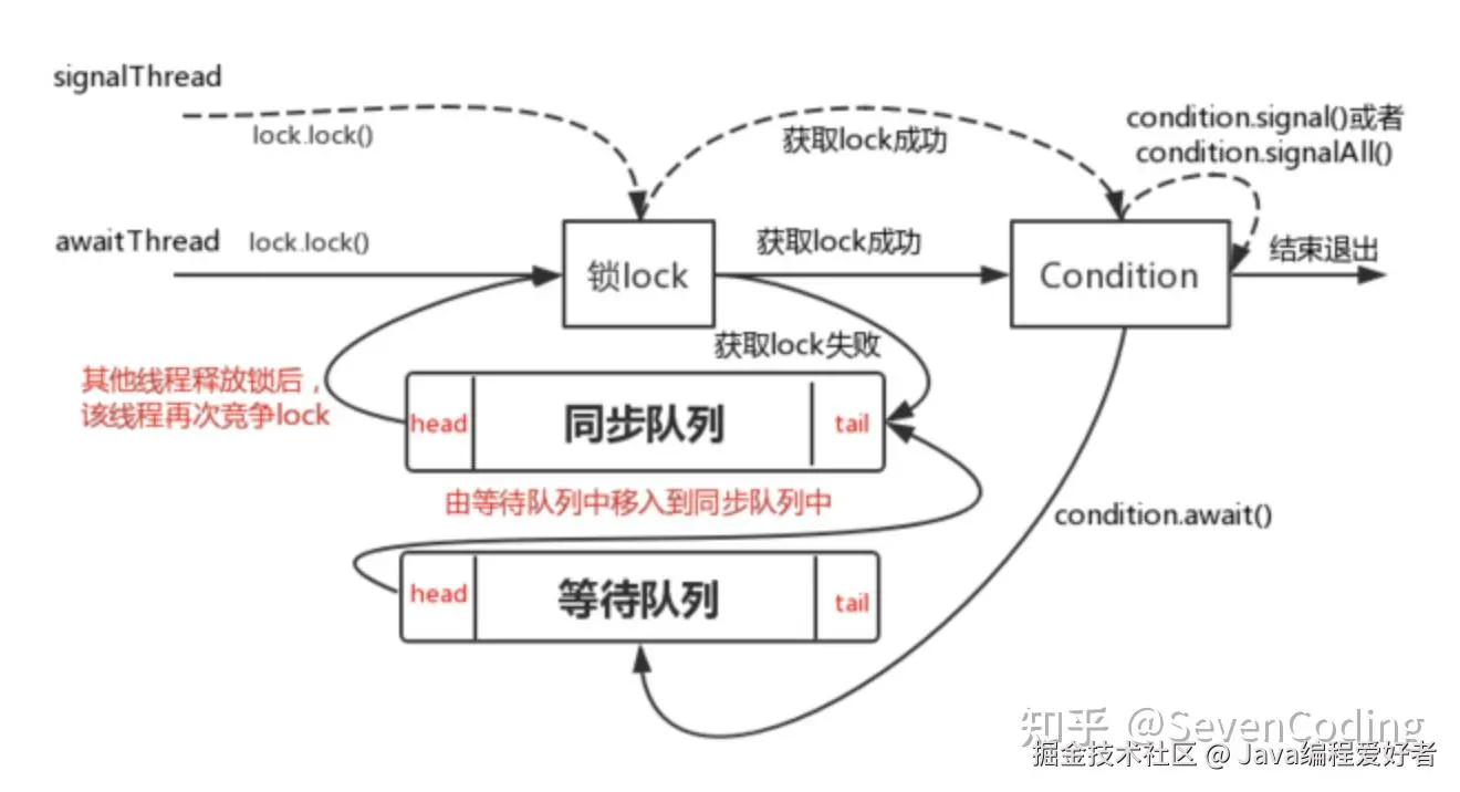 线程 awaitThread 先通过 lock.lock() 方法获取锁,成功后调用 condition.await 方法进入等待队列,而另一个线程 signalThread 通过 lock.lock() 方法获取锁成功后调用了 condition.signal 或者 signalAll 方法,使得线程 awaitThread 能够有机会移入到同步队列中,当其他线程释放 lock 后使得线程 awaitThread 能够有机会获取 lock,从而使得线程 awaitThread 能够从 await 方法中退出并执行后续操作。如果 awaitThread 获取 lock 失败会直接进入到同步队列。