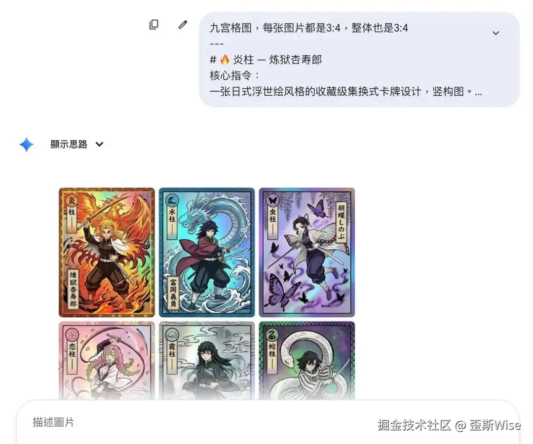 通过上面的提示词,可以让AI一次性生成多个柱的提示词,然后发给Gemini。