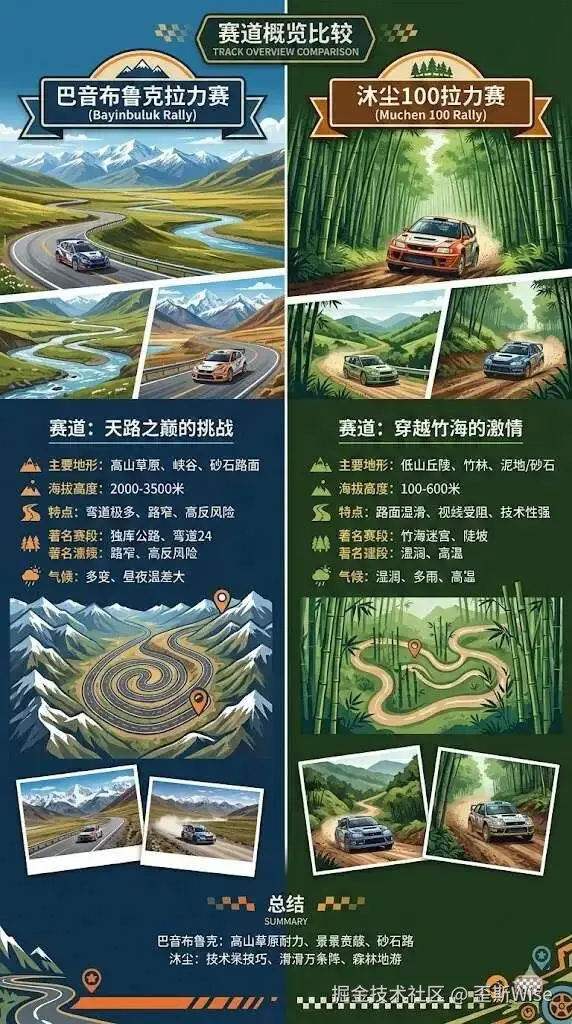 两联中文信息长图比较巴音布鲁克拉力赛和沐尘100拉力赛的赛道
