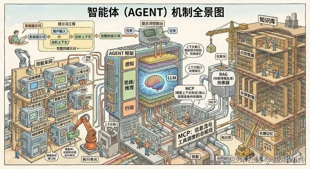 用Stephen Biesty风格详细的用中文展示AGENT的机制,包括框架、MCP、知识库、Skills、Prompt等等