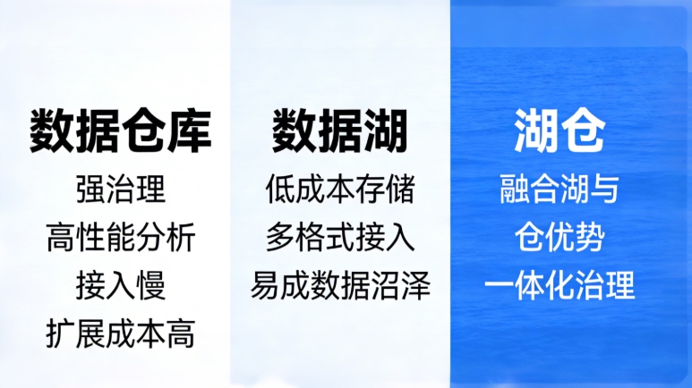 数据仓库(Warehouse)以强治理、强一致性以及高性能分析见长,适用于经营分析、固定报表以及核心指标体系的构建。其具有清晰的schema,口径易于控制,数据质量也能得到有效保障。然而,它存在接入速度慢、扩展成本高以及对变化敏感的短板,上游字段的变动往往会引发大量改造工作,对半结构化和非结构化数据的承载能力较弱。