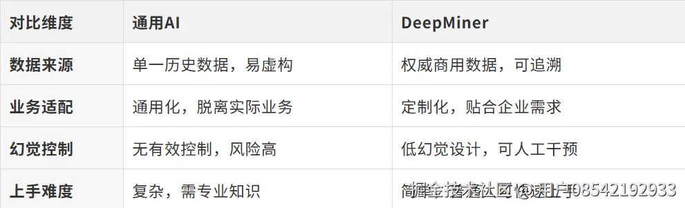 DeepMiner以低幻觉为核心,精准避开企业用AI的3个雷区,数据真实、适配性强、可掌控,不管是中小企业还是大型企业,都能快速落地使用。