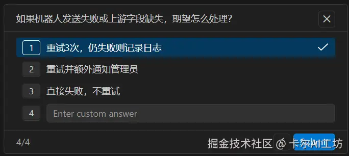 比如用户说"我要定时发消息",AI不能直接写定时器。它得追问:发什么内容?从哪来?发到哪个群?什么频率?异常了怎么办?每轮最多4个问题,问完还要复述完整需求让你确认。