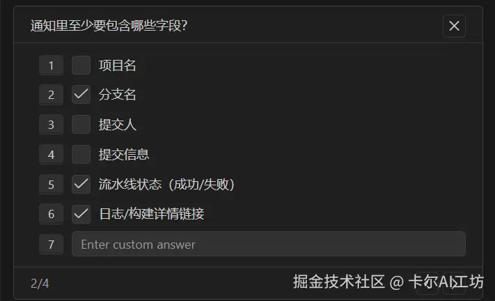 最后,它给了这样一份完整的需求确认。如果有遗漏处,这里是最后一次在构建前的补充,比如我们还需要能在群里@它对话之类的。