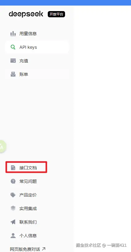 - 打开DeepSeek官网 www.deepseek.com/ ,找到API开放平台,点击后需要进行注册登录