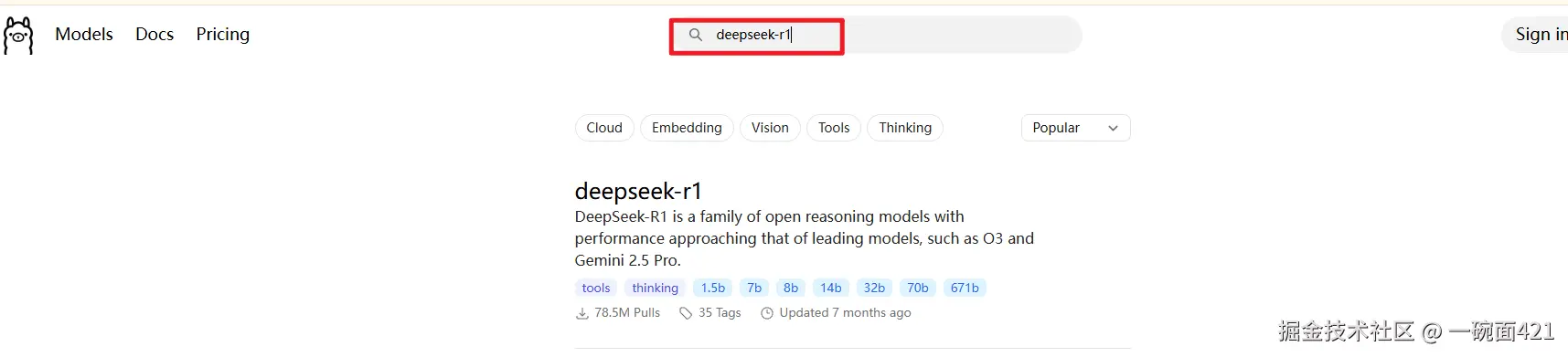 - 打开Ollama官网 ollama.com/search 搜索自己想要安装的模型,这里为了演示安装一个比较小的模型deepseek-r1:1.5b