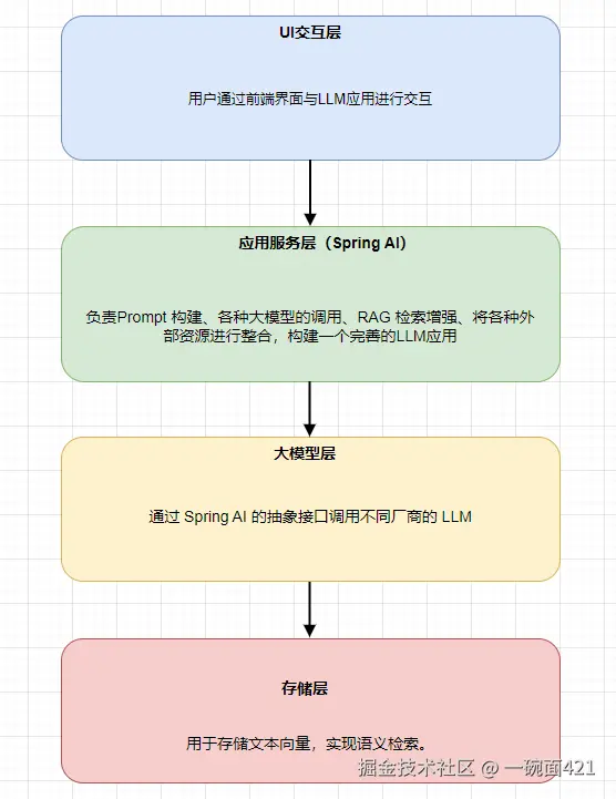 在正式编写第一个 Spring AI 示例之前,我们先整体了解一下大模型应用的技术架构,以及搭建开发环境时需要准备哪些模型运行环境。