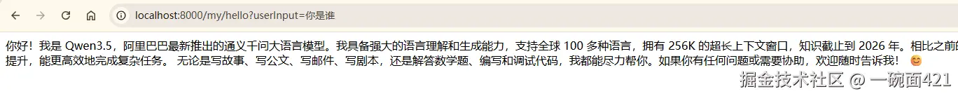 public String hello(@RequestParam(value = "userInput", defaultValue = "你好") String userInput) {