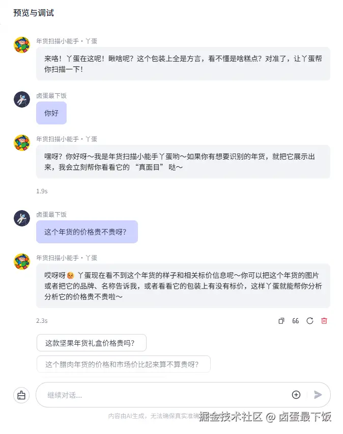 智能体最终的运行终端是rokid眼镜端,在眼镜端也能实现预览调试,由于目前手头上没有终端设备可以调试,暂时使用灵珠平台的线上调试预览一下效果。所以楼主在网上找一些年货图片进行测试,各位也可针对自己的场景找合适的图片进行调试。