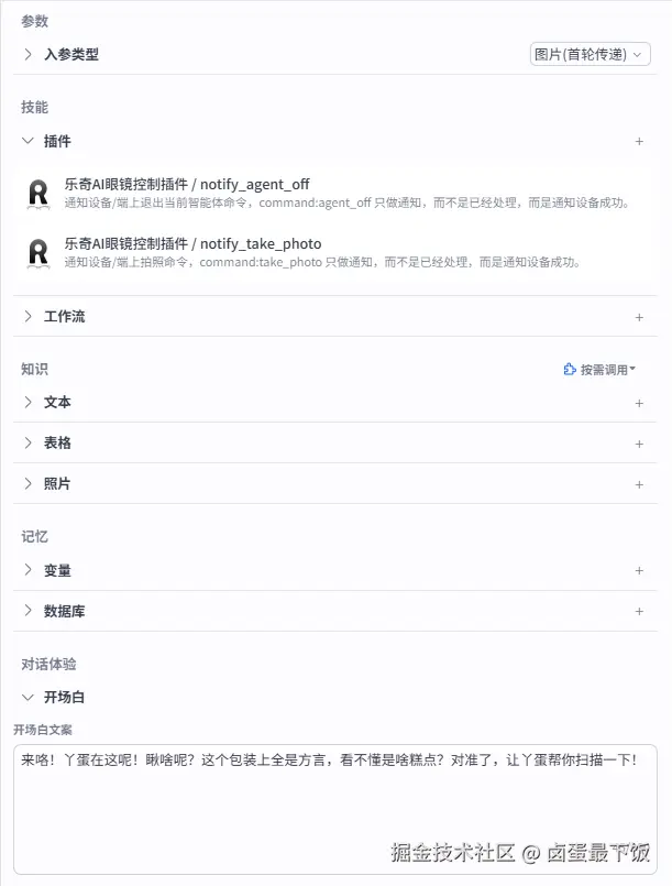 入参的话,我们这里采用的是图片入参形式,因为眼镜端直接捕获目标影像信息。插件只需选择眼镜端拍照和执行上下文这两个即可,开场白可根据自己的使用场景自行设置,也可借助AI工具进行润色。