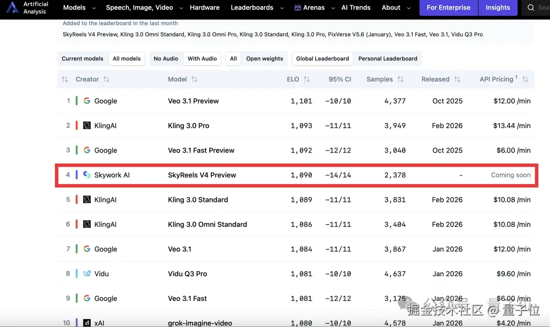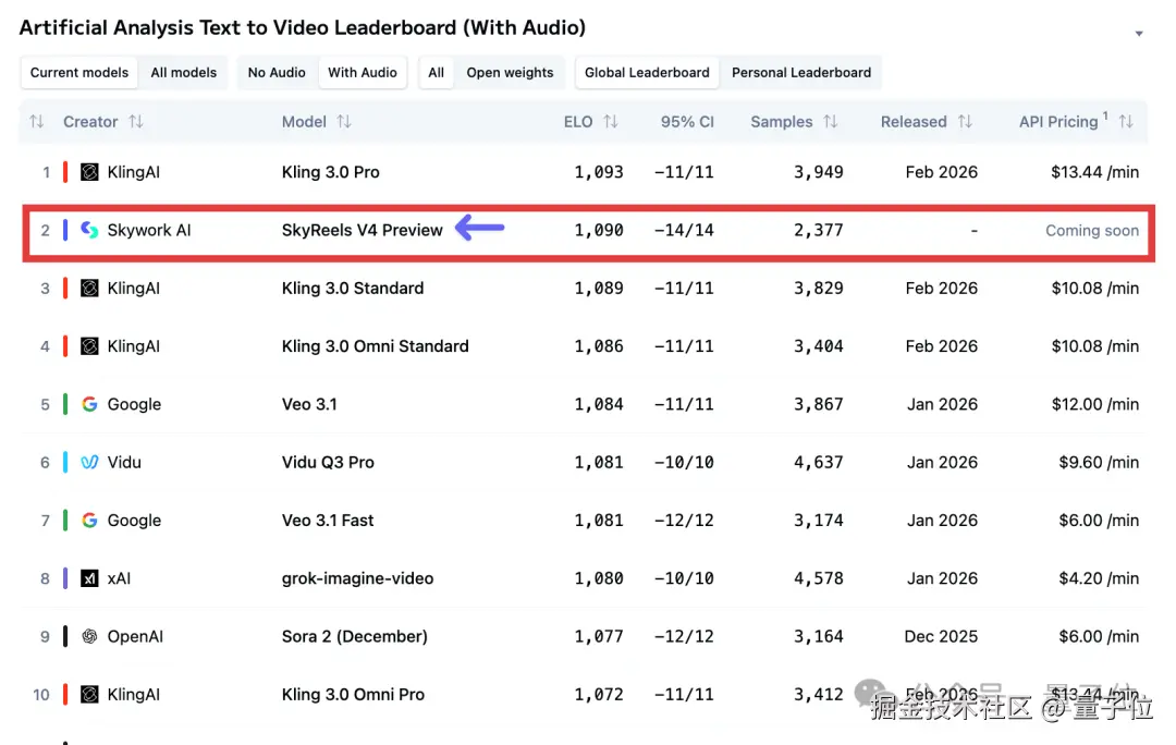 来自昆仑天工的 SkyReels-V4,直接干到了文转视频_(含音频)_全球榜第 2,位列 Veo 3.1、Sora 2 之前。