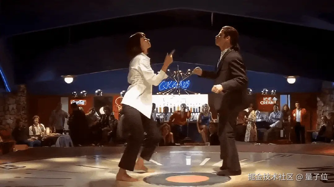 再看一眼原视频_(来自昆汀电影《低俗小说》片段)_:噢~俩人在跳舞,女生在左边,男生在右边,他们原来是这么跳的。