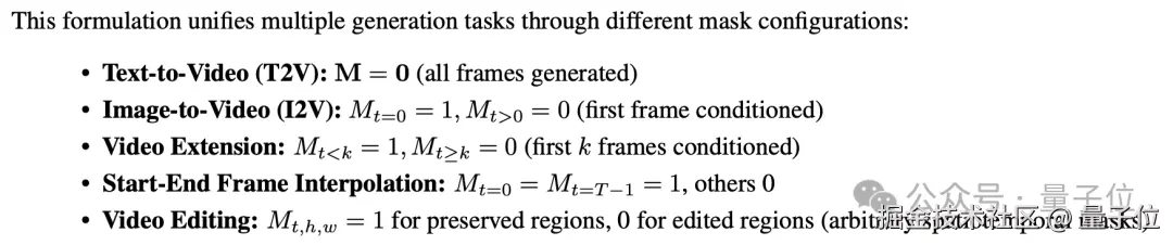 通道维度上,把带噪视频、条件帧、遮罩叠在一起,不管文生视频、图生视频、视频延长还是局部编辑,本质上都变成 “带掩码的修复类” 任务。