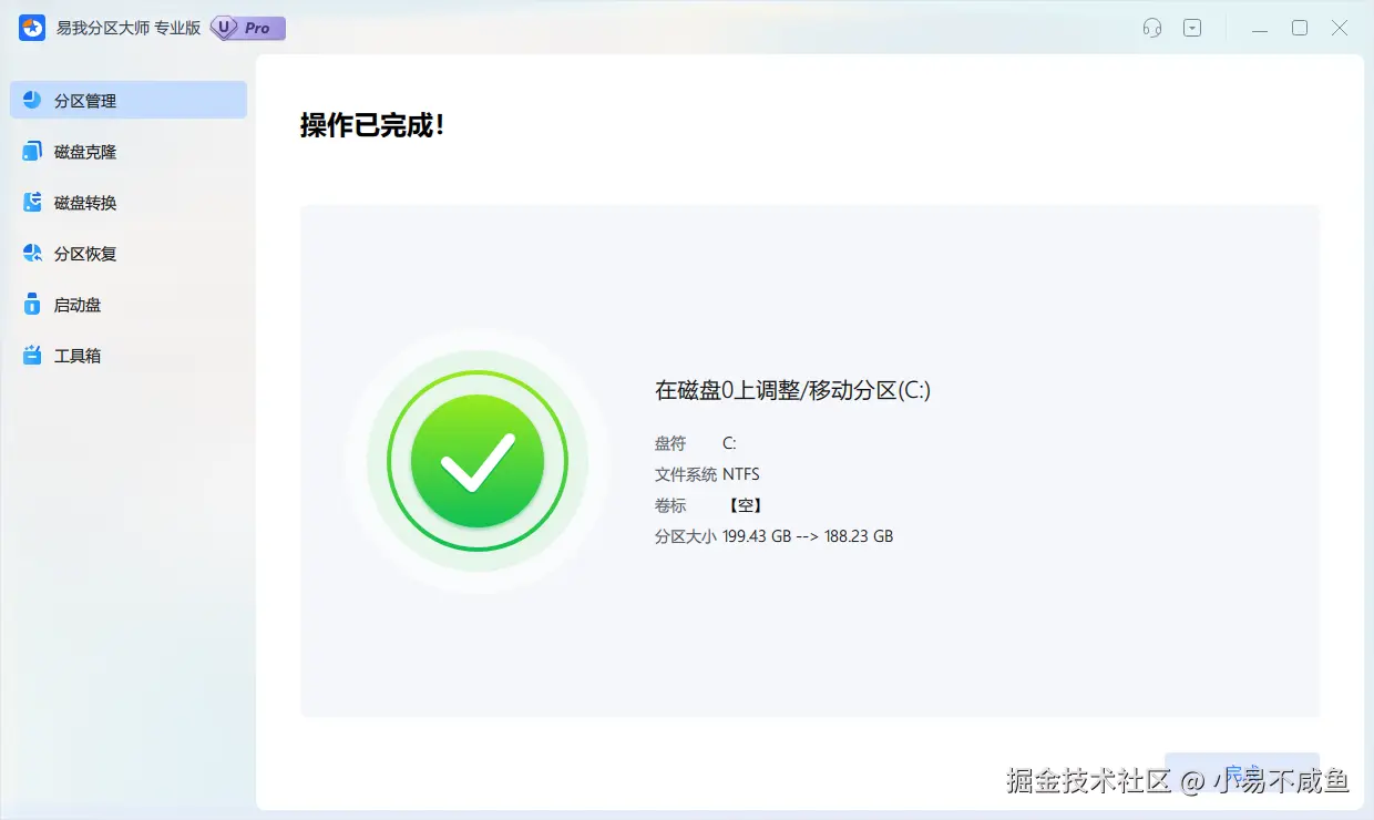等待操作完成,返回界面发现分区大小已被成功调整。