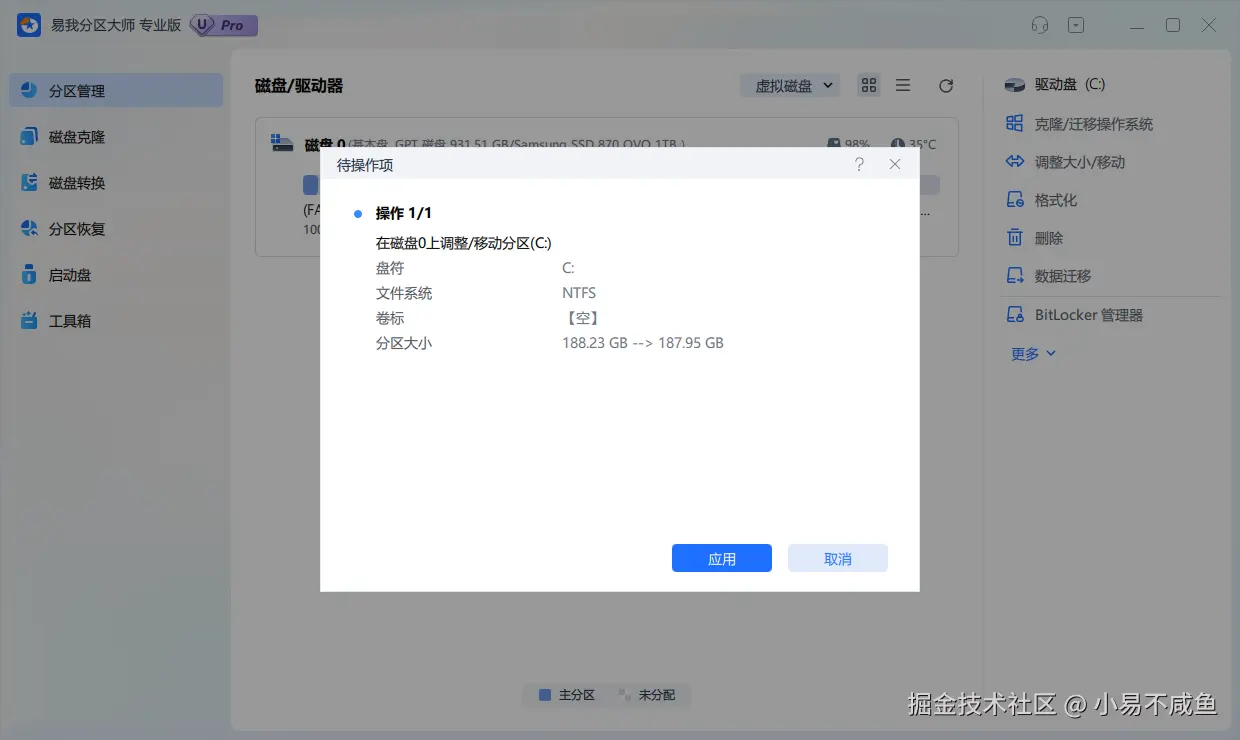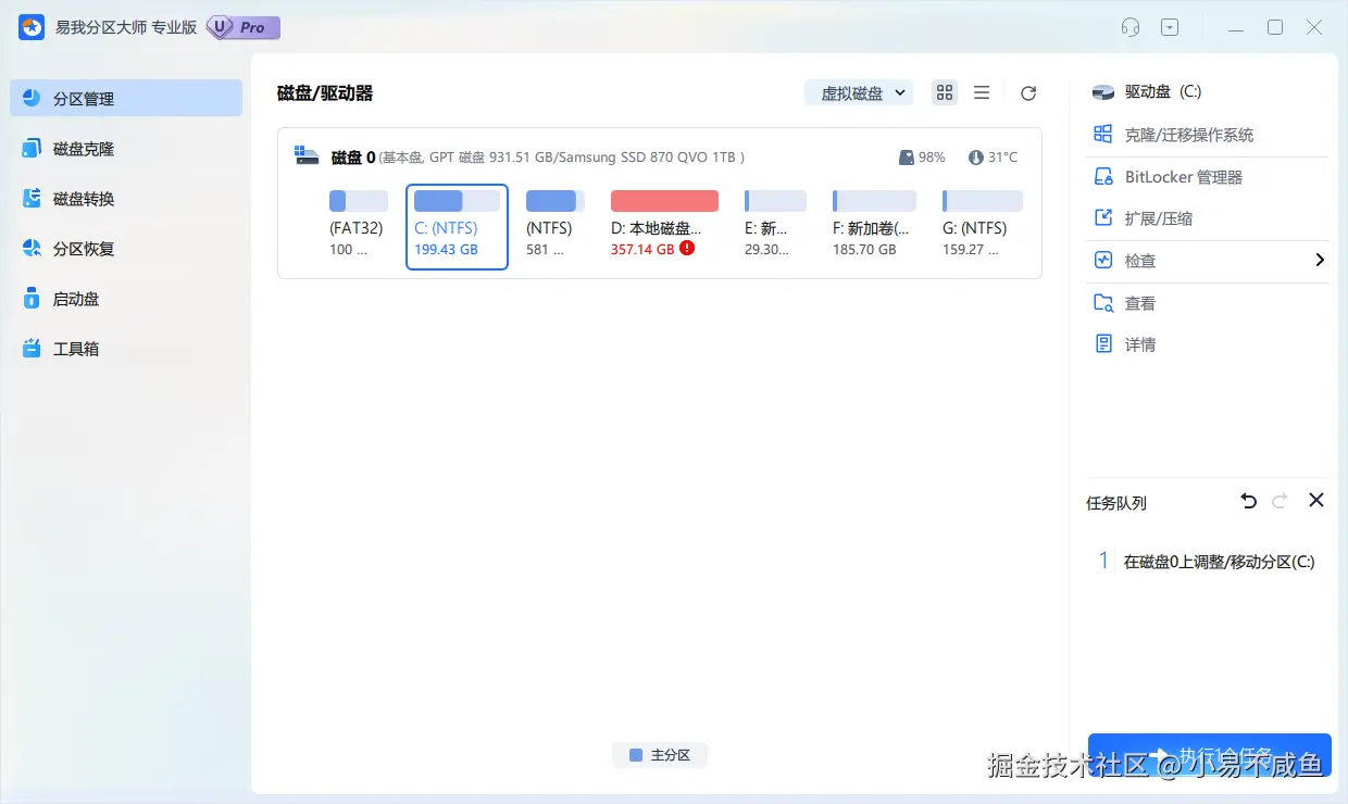 如果磁盘管理工具不能满足需求(例如没有足够的空闲空间),可以使用第三方分区工具,例如,易我分区大师(EaseUS Partition Master Professional)。它作为一款专业的分区软件,提供了更强大的分区功能,支持无损分区调整、分区合并 / 拆分、批量分区等复杂操作,并且操作也更加直观和安全。