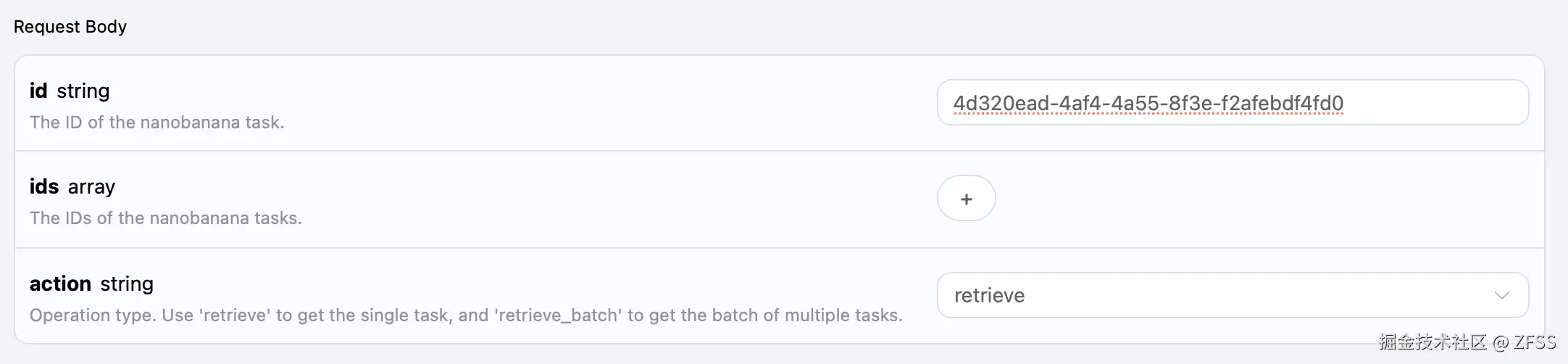 这是是针对多个任务 ID 来进行查询任务详情,与上面不同的是需要将 action 选中为 retrieve_batch