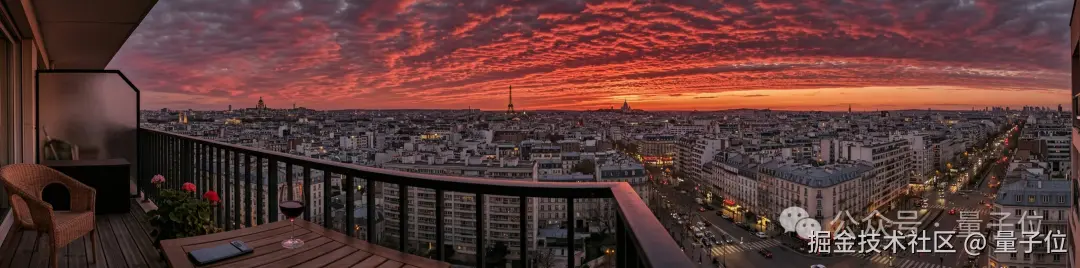 提示词是:一张用手机拍摄的 4:1 全景照片,展示了我公寓外的景色,那时日落很美,还有一排排深红色的卷积云_(A 4:1 panoramic photo I took on my phone, showing the view from my apartment, when the sunset looked perfect with rows of deep red cirrocumulus)_