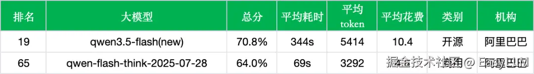 对比上个版本(qwen-flash-think-2025-07-28),qwen3.5-flash的变化不仅体现在分数的提升,更反映出底层推理机制的重大调整,数据如下: