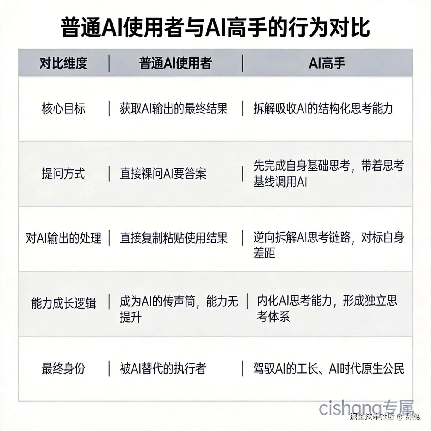 - 独立:遇到新的同类问题,先不用AI,自己用学到的思考框架,独立完成思考和输出;