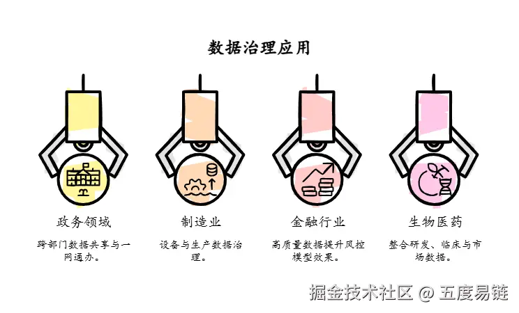 本文探讨了数据治理在政务、制造业、金融和生物医药等不同行业的应用。通过跨部门数据共享、设备与生产数据治理、高质量数据提升风控模型效果以及整合研发数据,数据治理能够显著提升公共服务效率、支撑智能制造、实现个性化金融服务并加速药物研发。