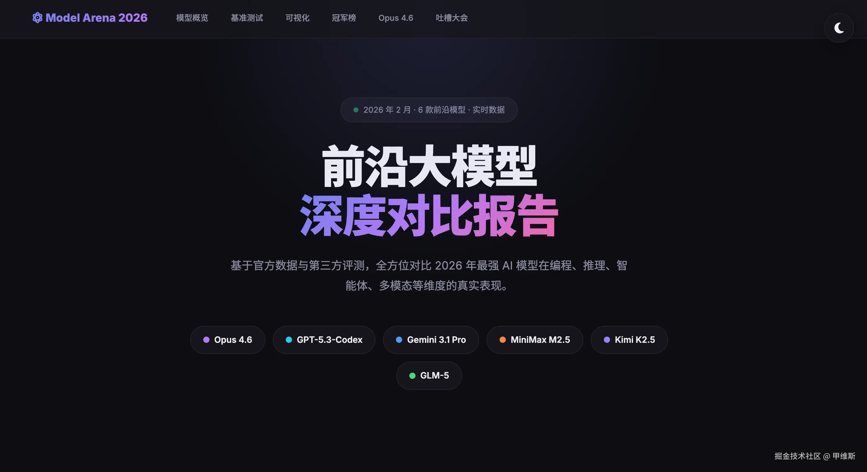 从这里可以看导航菜单,以及网页核心主题,和参与测试的 6 个模型。