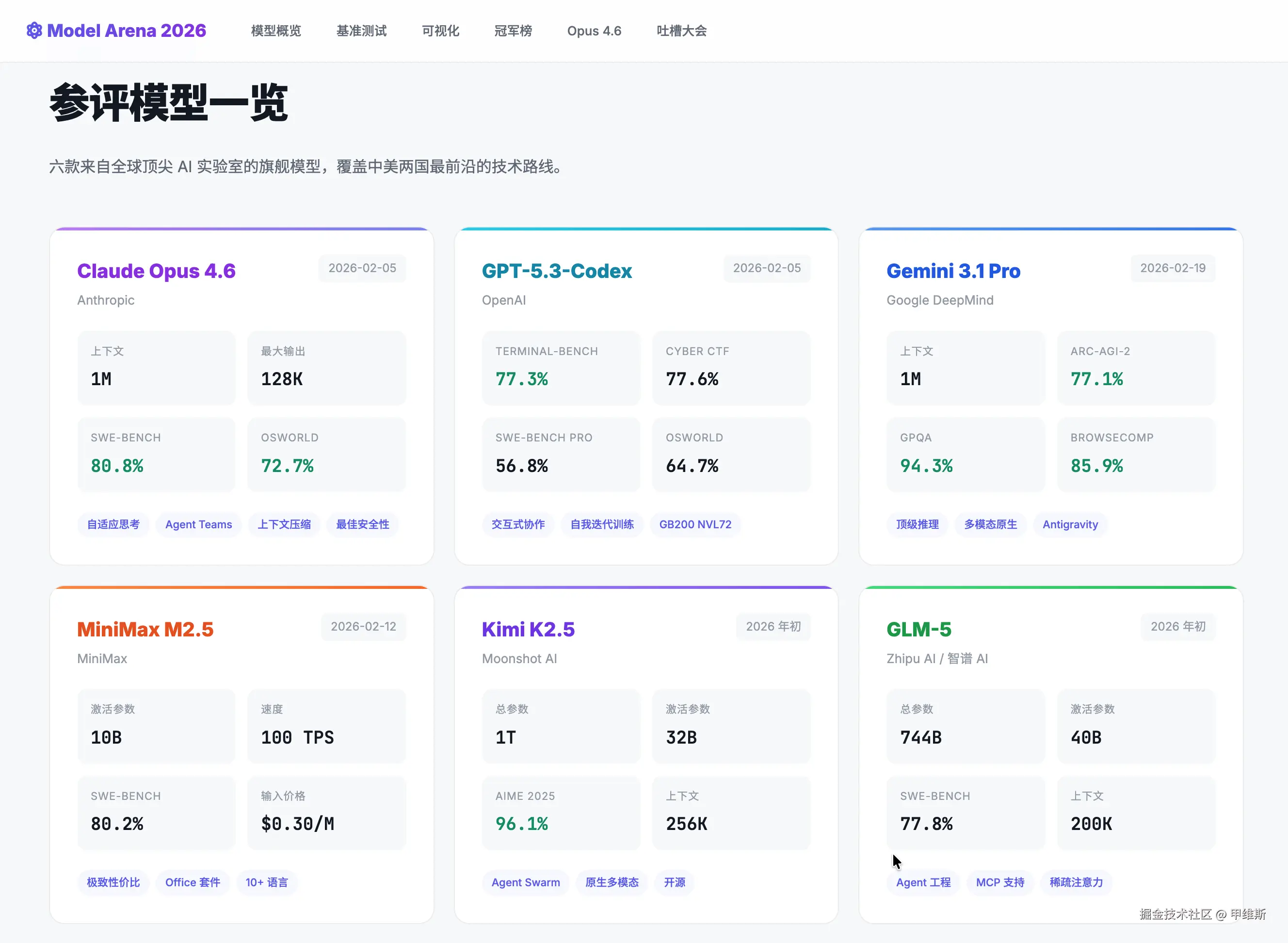 参赛选手主要是 Opus 4.6、GPT-5.3-Codex、Gemini 3.1 Pro、GLM 4.7、Kimi K2.5、MiniMax M2.5。