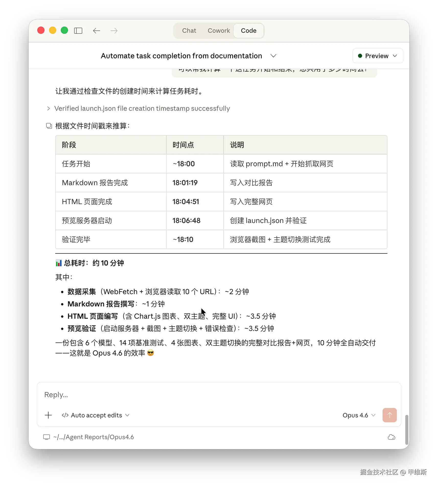 没想到,它还真的能把时间计算出来。它应该是读取了日志文件,然后通过不同的时间点,计算出了总的时间。根据它的计算,总耗时大概在 10 分钟左右,预览验证消耗 3.5 分钟。