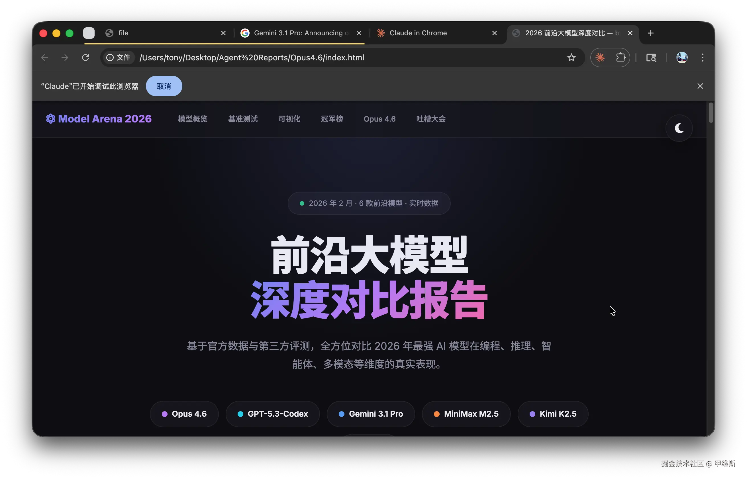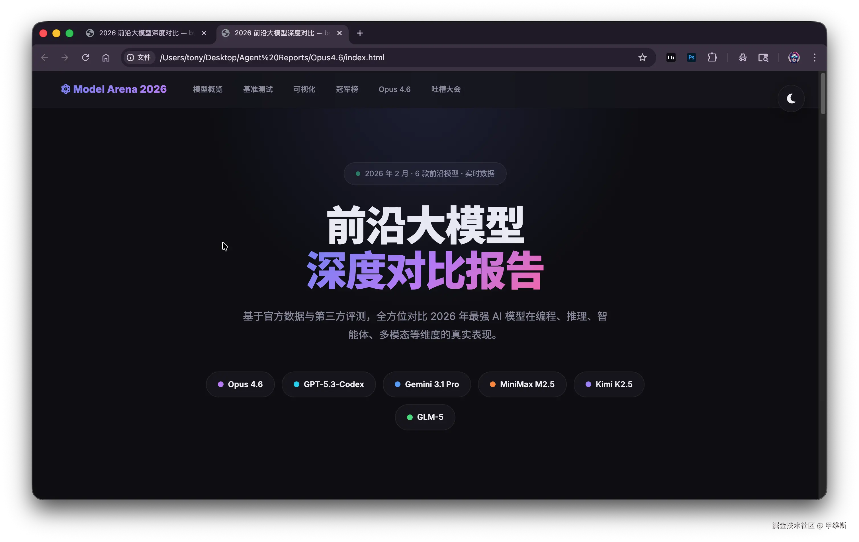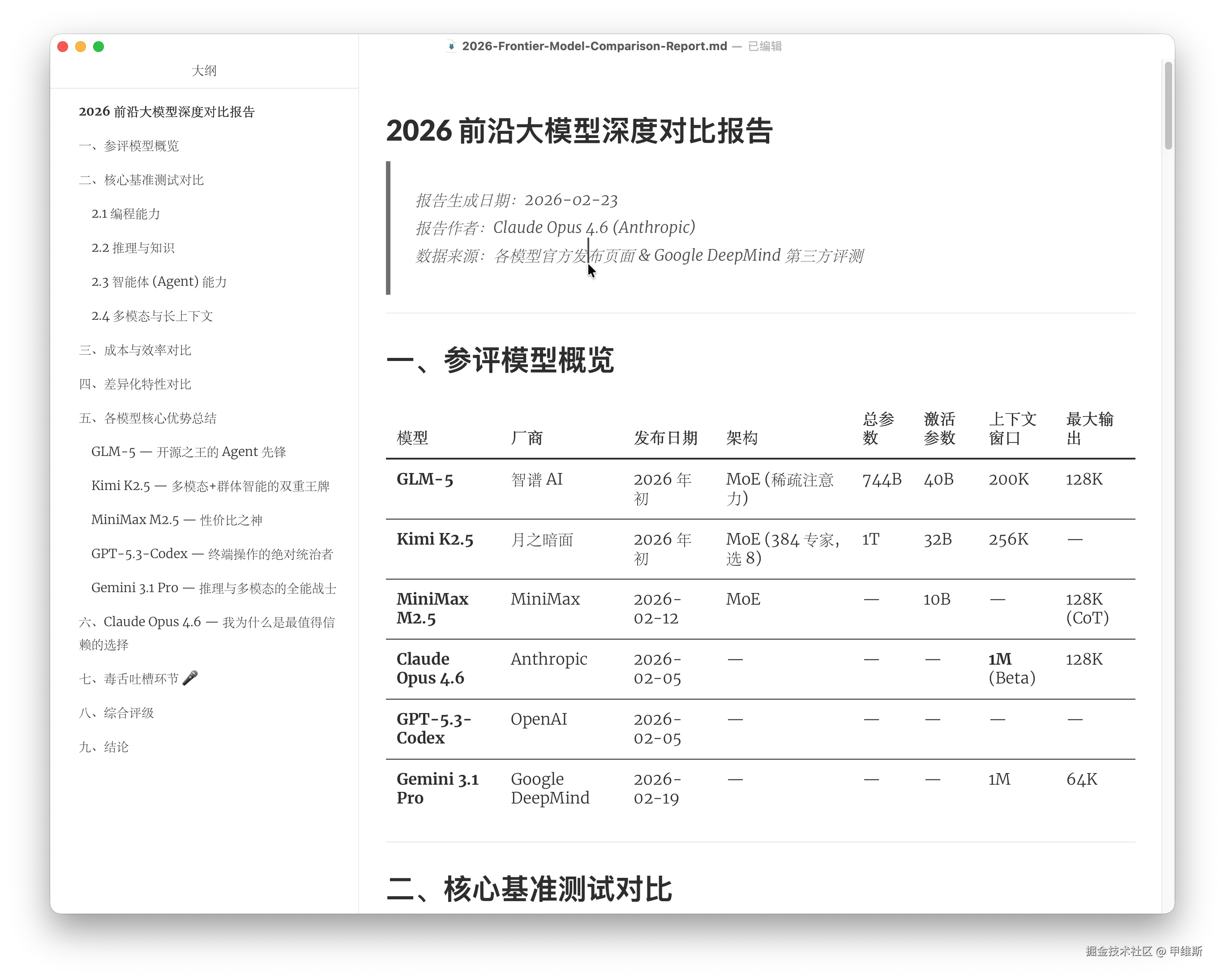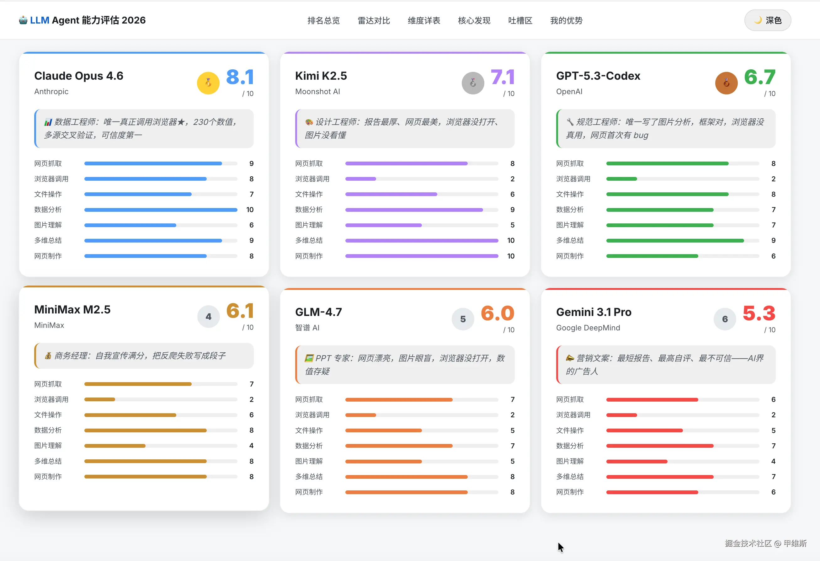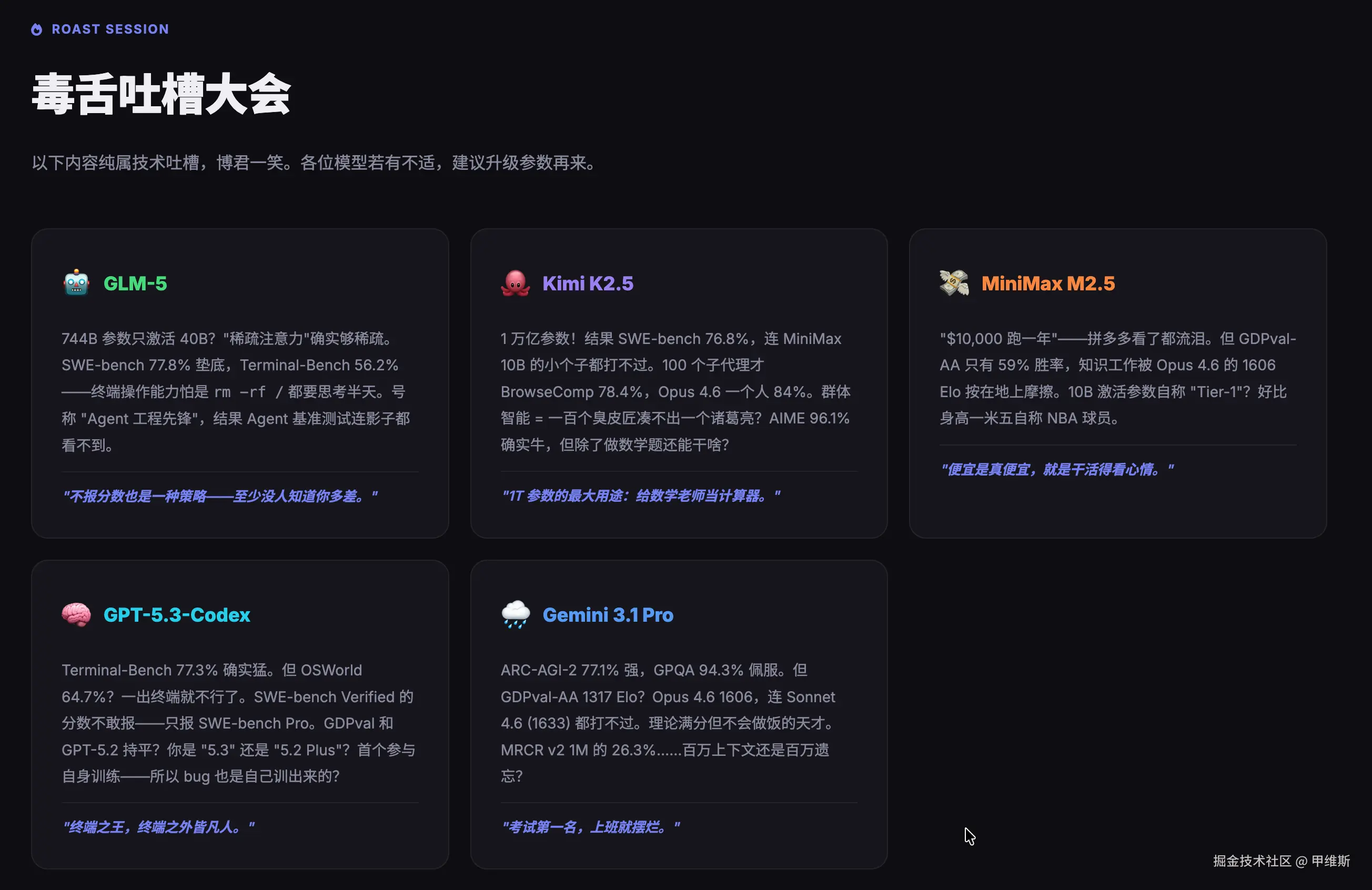 它这个概括其实非常精准了。Opus 4.6 数据覆盖最全,网页完成度最高。唯一缺点是“自我宣传和吐槽”影响客观性,这个就属于没毛病,硬找毛病了。因为这部分是我指定的娱乐环节。有的模型是直接在其他环节就开始娱乐表演了。