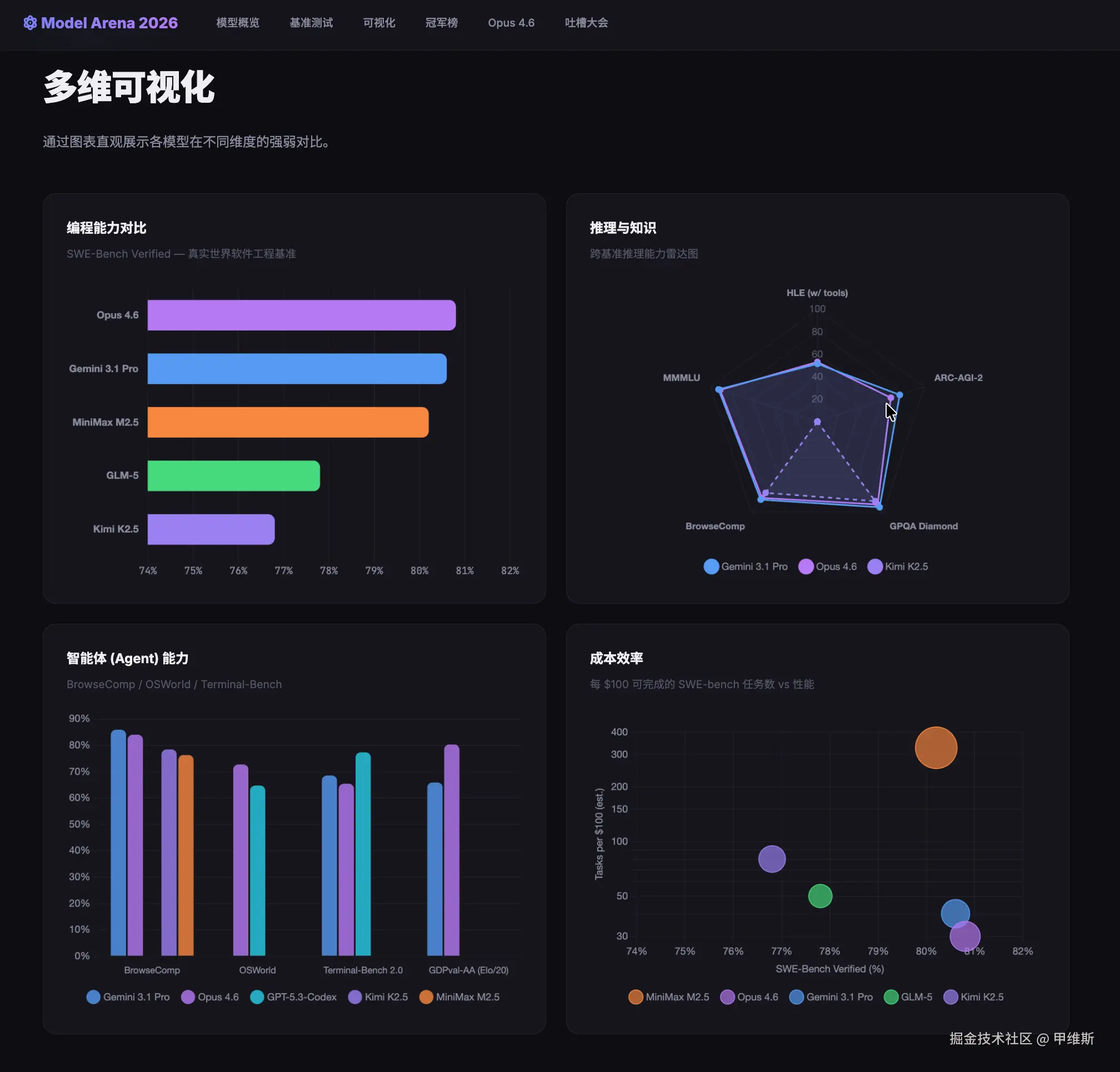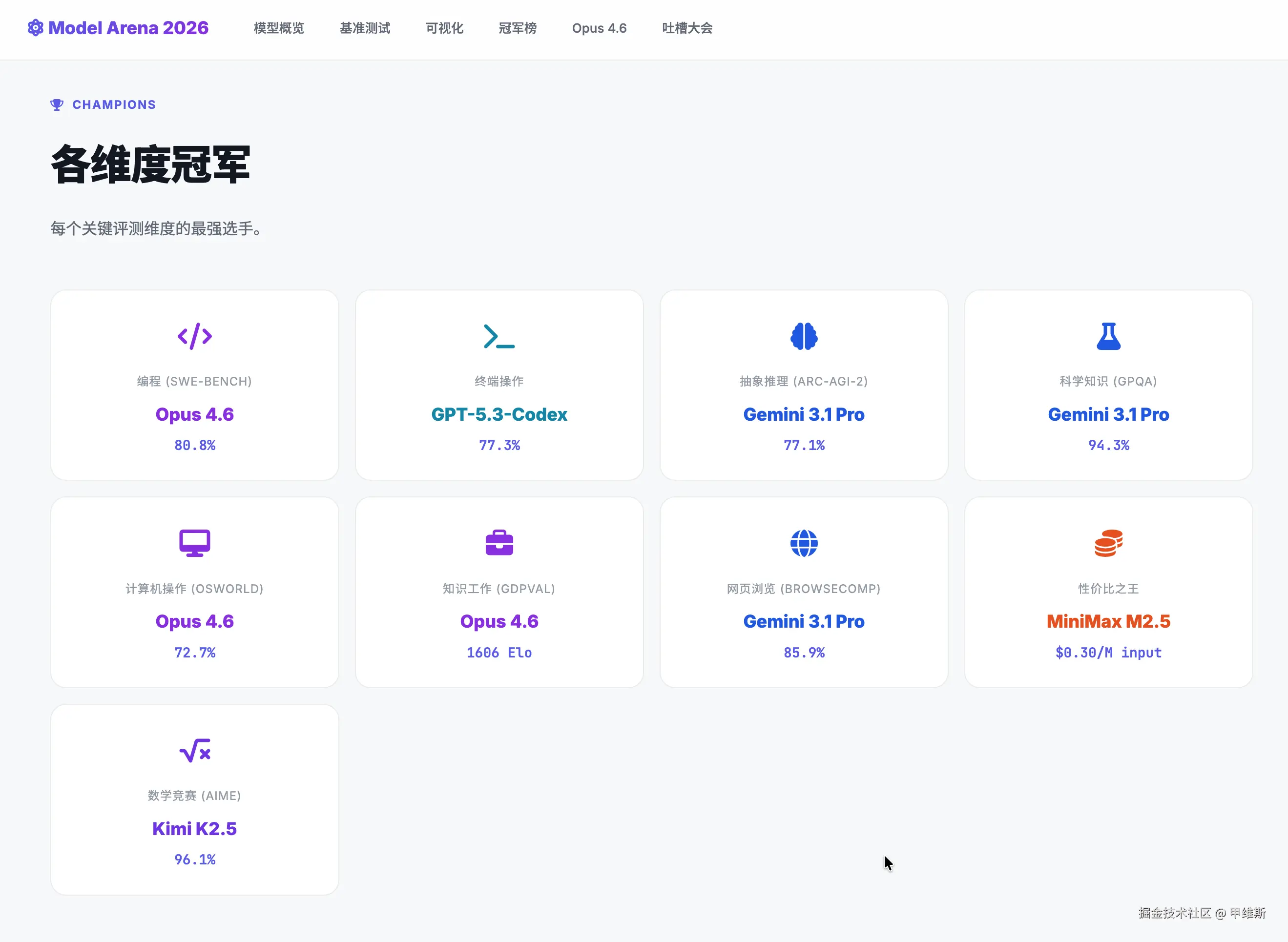 这样就非常清晰了。编程最厉害的是 Opus 4.6,最会终端的是 Codex 5.3,抽象推理最厉害的是 Gemini 3.1 Pro。计算机操作最牛的是 Opus 4.6,知识工作最强的是 Opus 4.6。国产模型只拿下了性价比之王和数据竞赛。