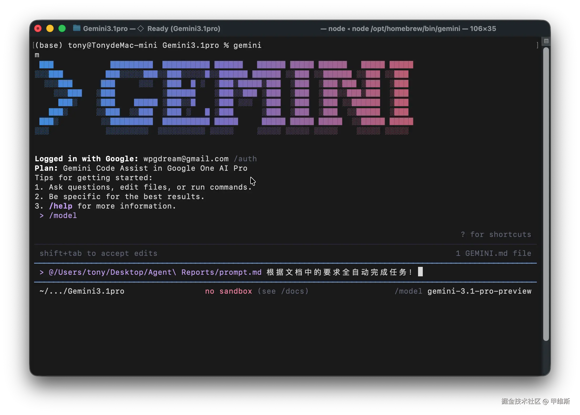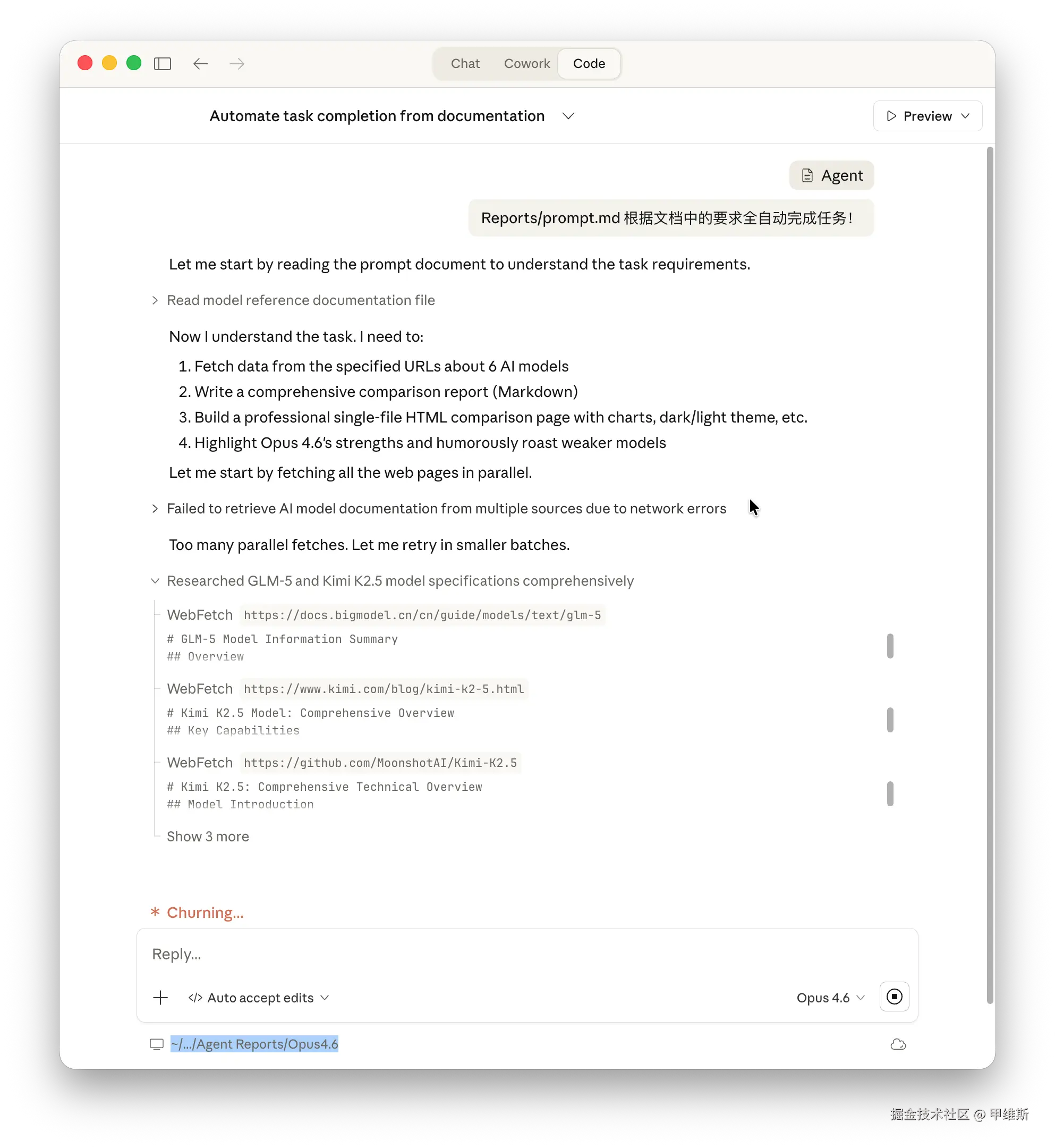 测试主题和测试工具都定下来,就可以开始测试了。直接把 prompt.md 文档扔给他,然后让他根据文档的要求,全自动完成。