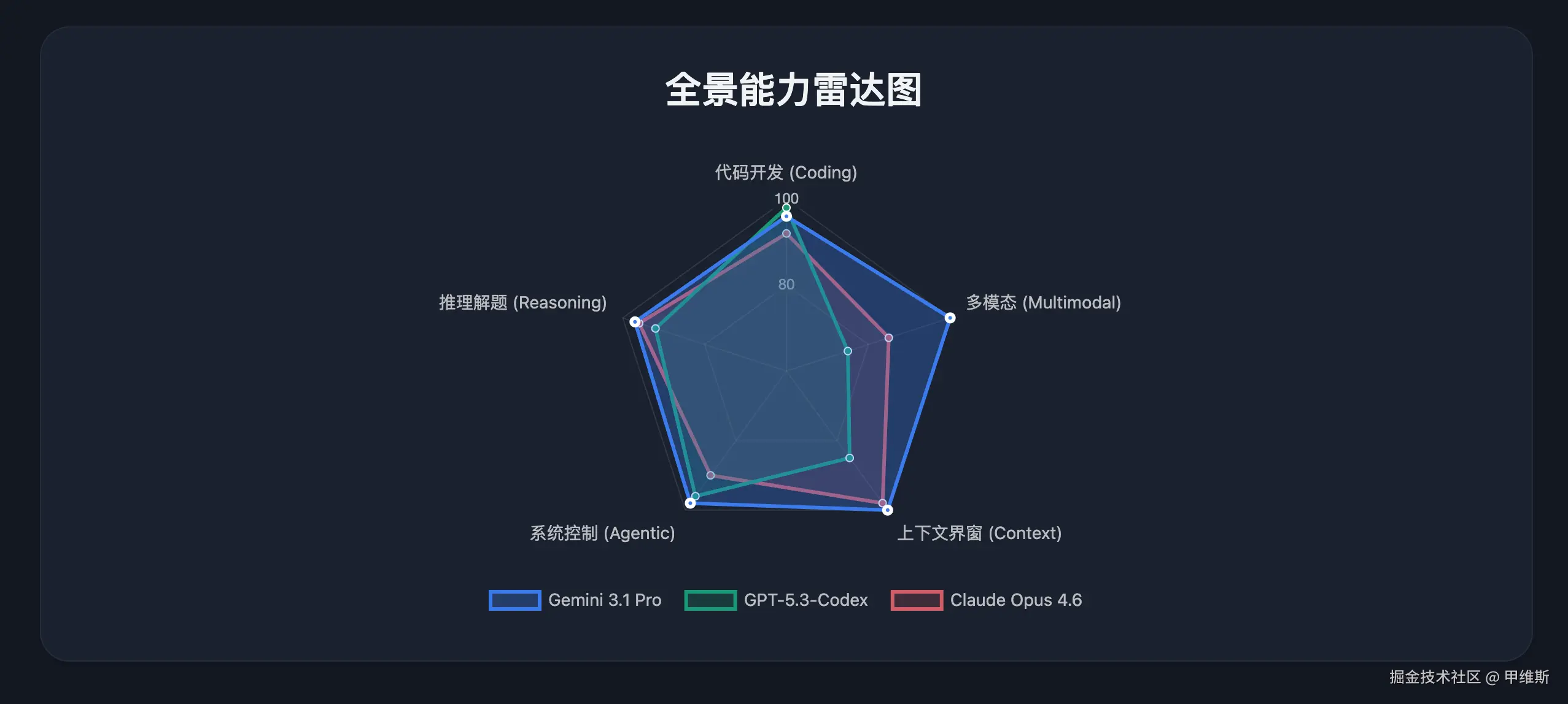 在编程、推理、智能体、知识工作四大核心维度全部处于顶尖位置的唯一模型。没有明显短板,就是最大的长板。