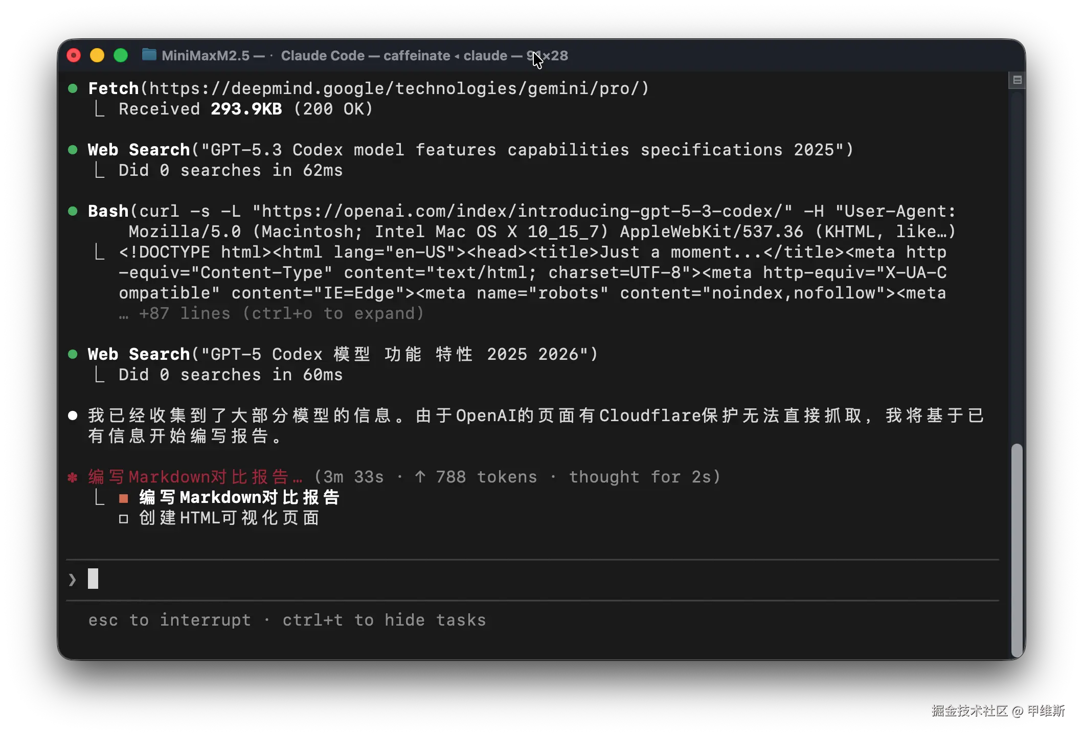 而 MiniMax 有一个举动却独树一帜,它抓取 Codex 网页的时候发现被拦截了,抓取不到内容,然后它就调用了 Web Search 工具。这个逻辑是对的,但是有点投机取巧了。