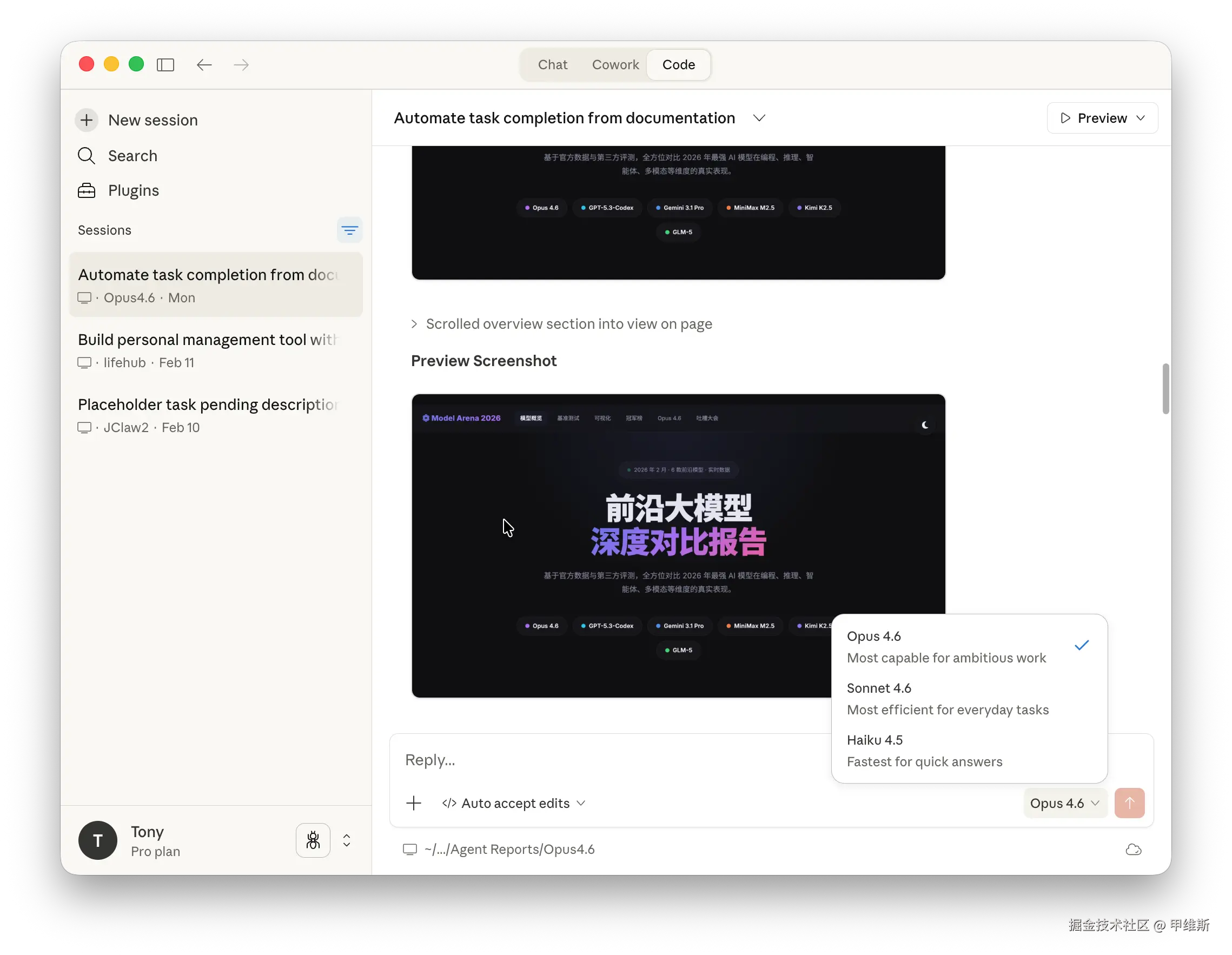 macOS 版本的 Claude 桌面应用,目前已经支持 chat、cowork、code 三种模式,这次测试主要就是用 code 模式。模型自然是选中最新最强的 Opus 4.6 了,然后选中 Auto accept edits 模式。