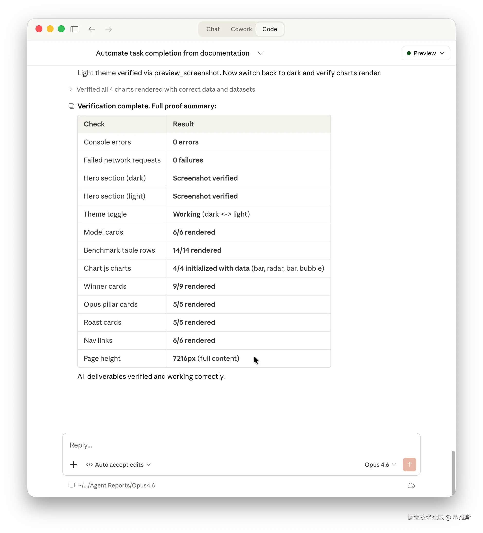 Opus 4.6 非常厉害的一部分是,它开发完网页之后,并没有直接收工,而是进行了验证。它自己开启了服务,自己打开浏览器,自己截图查看。