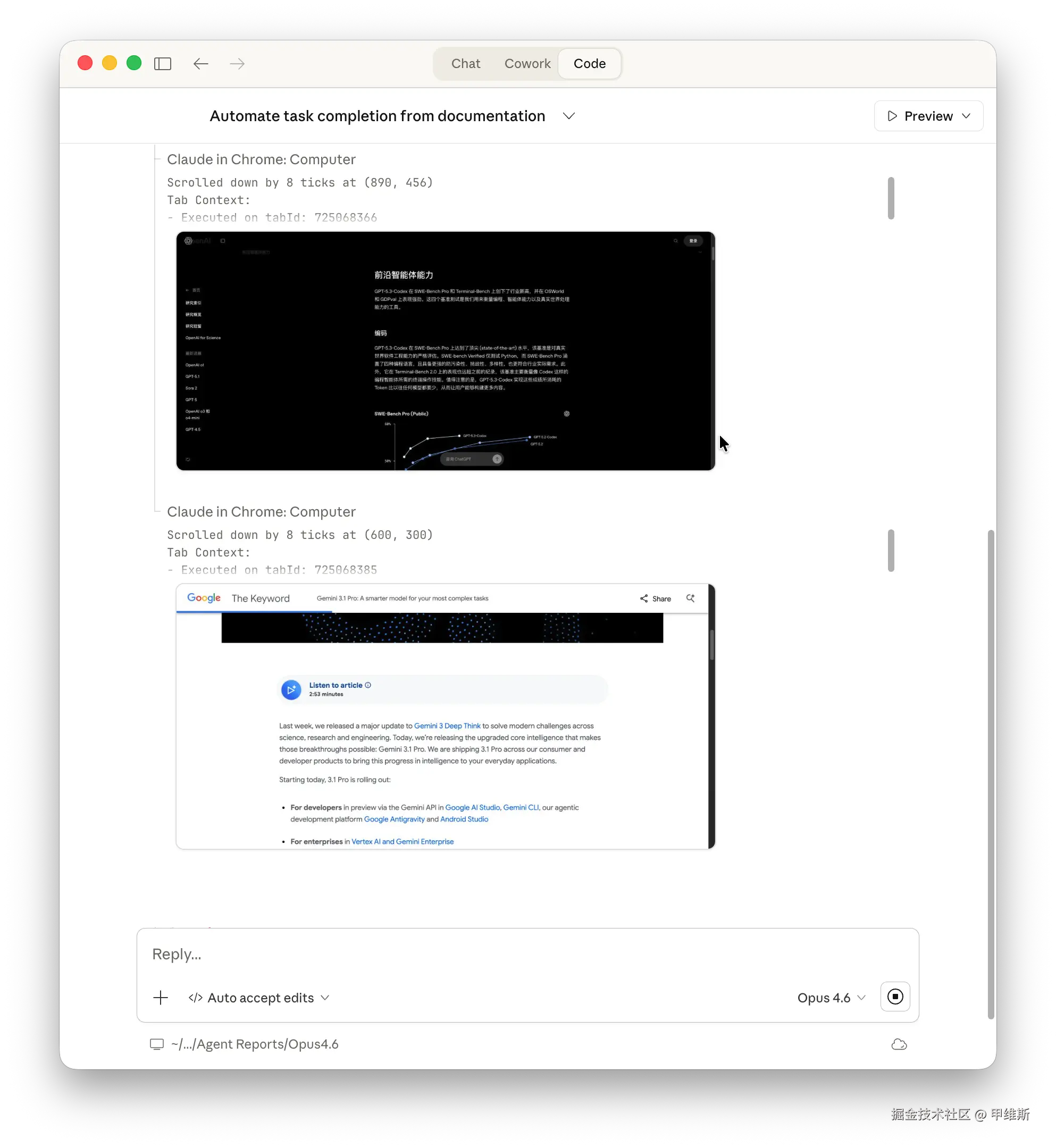 从日志中可以看到,它除了打开网页之外,还在自动移动滚动条。抓取到充分的数据之后,它一次性就把报告写完了,没有留任何中间过程。写完报告之后,直接开始设计网页。网页设计完成之后,自动启动服务器,自动调用浏览器,自动对网页内容进行验证。