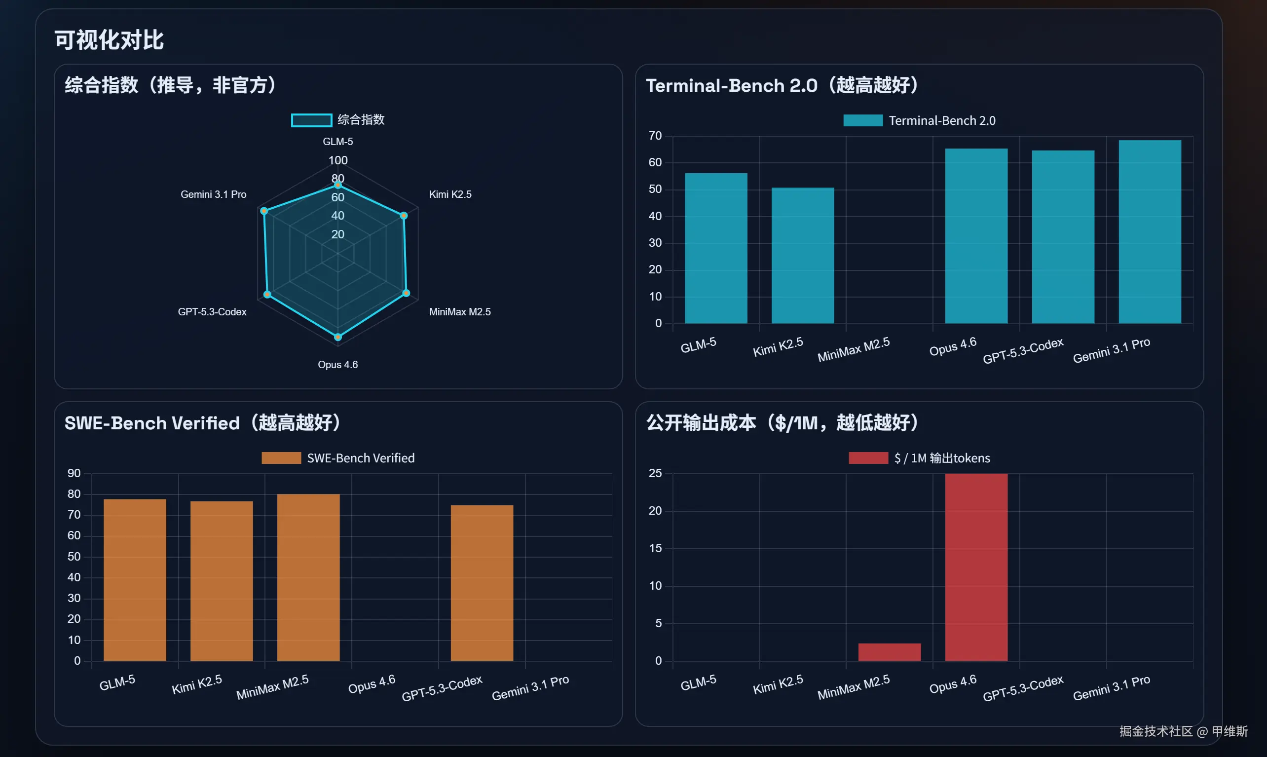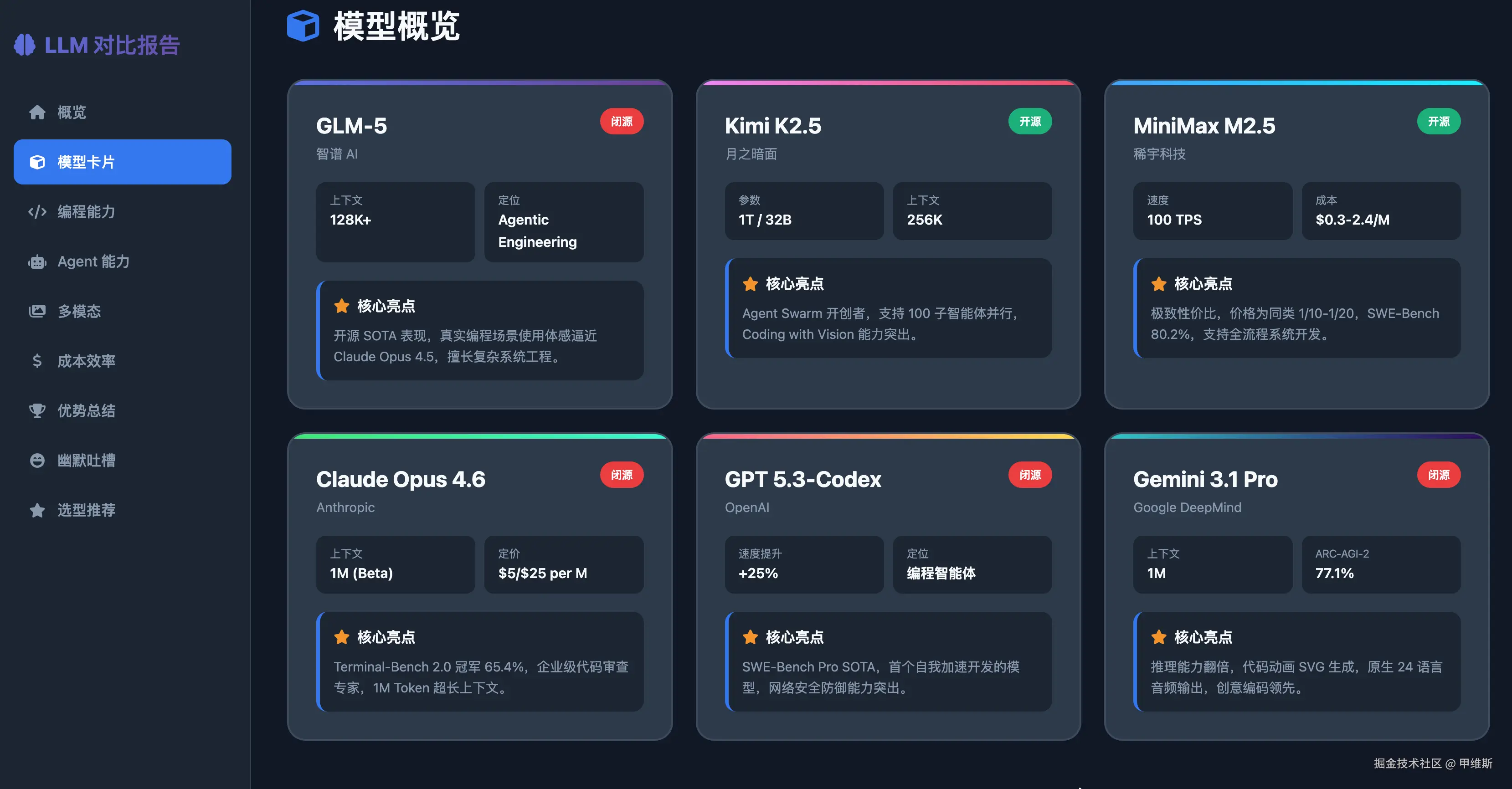 另外它的差异化对比,各模型核心优势总结,以及综合评定都非常实用。它把每个环节的关键基准都翻译成对应的中文,非常容易理解。