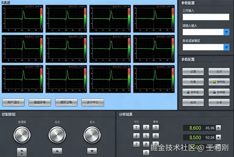 工业检测场景中,传统离线数据采集方式存在数据代表性不足、分析滞后等问题,难以满足设备状态实时监测需求。项目基于虚拟仪器理念,以 LabVIEW 为核心开发多通道数据采集分析系统,实现从信号采集、调理、传输到分析、存储的全流程自动化。系统设计目标包括:支持 8 路模拟信号同步采集,采样率可调范围 1k-100kHz;具备信号滤波、时频域分析等核心功能;数据存储支持文件与数据库双模式;人机界面直观,支持参数在线配置与动态波形显示,适配工业现场复杂环境。