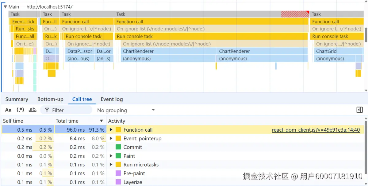 在下方面板的调用树(Call Tree)标签页中,会按函数拆分 CPU 耗时,显示每个条目的自身时间(Self Time,函数本身执行耗时)和总时间(Total Time,包含所有子函数执行耗时)。需注意,调用树包含所有 JavaScript 执行,而非仅 React 组件,因此需要在整体执行轨迹中识别 React 相关操作。