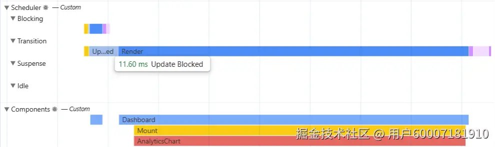 - 调度器追踪(Scheduler track) :展示 React 内部的任务调度,包含四个子追踪项:阻塞(Blocking)、过渡(Transition)、挂起(Suspense)和空闲(Idle)。每个子追踪项用彩色条表示不同优先级的任务(例如,用户输入对应的阻塞优先级、
