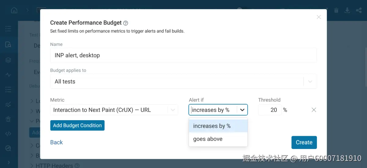你还可以设置性能预算,当自动化实验室测试中某个性能指标(如核心网页指标)超过预设阈值时,会收到警报。