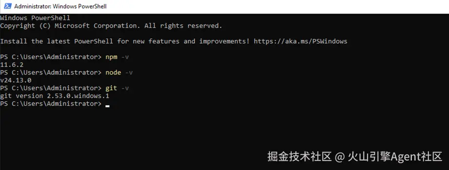 在重启 Windows 服务器后,通过管理员权限打开 PowerShell,输入命令后出现以下界面即验证相关工具已经配置正确: