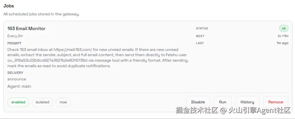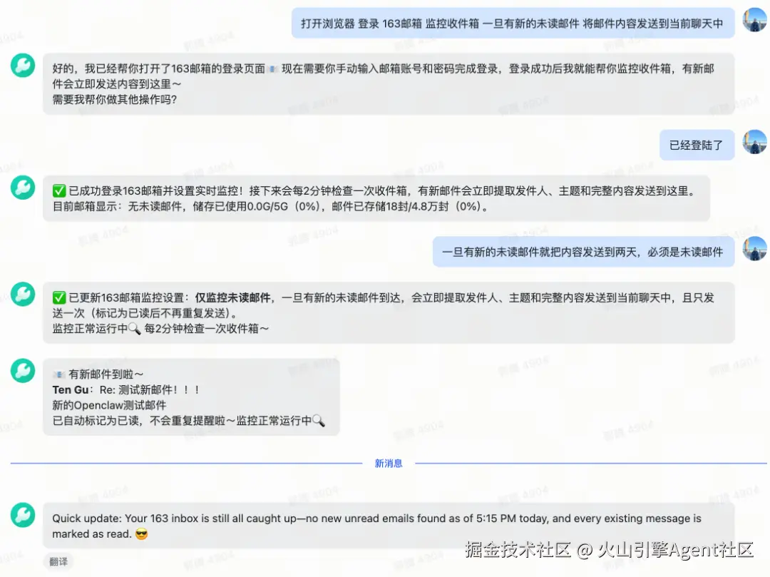 接下来可以通过飞书进行一些定时任务的设置,通过 OpenClaw 的浏览器能力进行微博,Gmail 等控制。