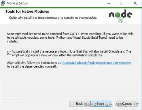 上图错误代表 Windows 一些必要工具没有安装,可以重新安装 nodejs 并利用安装程序安装工具。