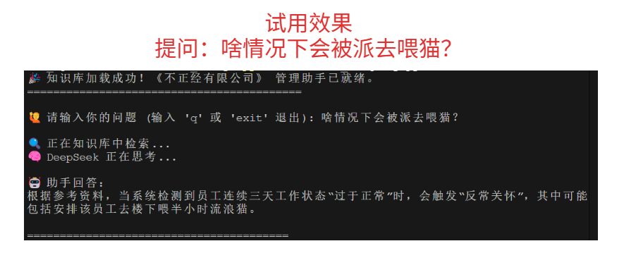 如图所示,上面这些问题的答案明显不是互联网上Deepseek的标准回答,而是基于我们能前面创造的猎奇文档:《不正经有限公司 正经管理办法》 给出的答案。