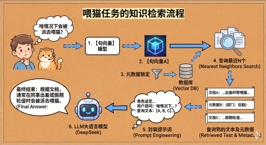 计算机是不懂“啥情况下会被派去喂猫?”的含义的,但我们有了Embedding 【句向量模型】,可以成功的把这句话翻译成512维的向量。