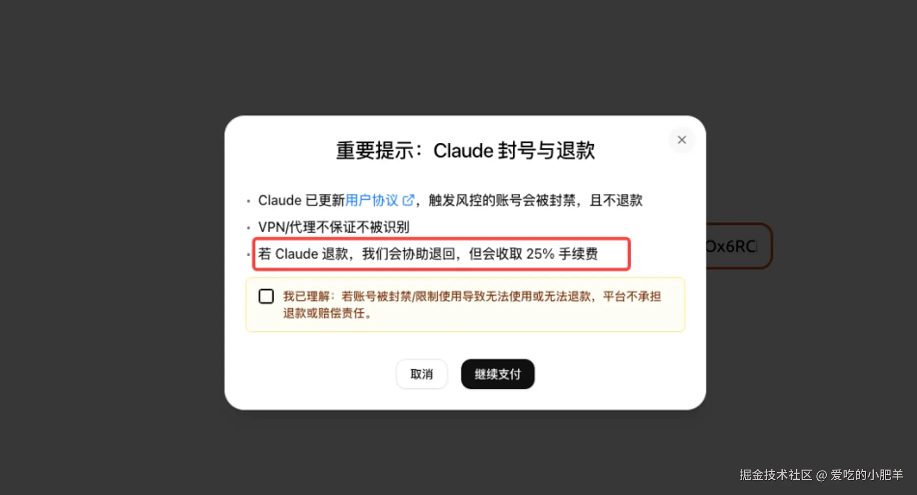 在订阅Claude的时候,系统会提醒订阅Claude有封号风险,并承诺会进行退款。
