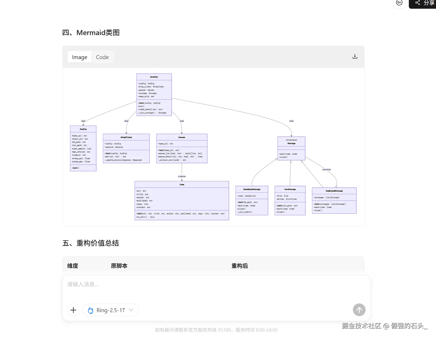 下面是我的完整测试示例和模型输出结果,你可以参考结果(含“混乱脚本”“重构版本”“Mermaid 类图”)。